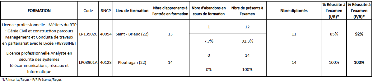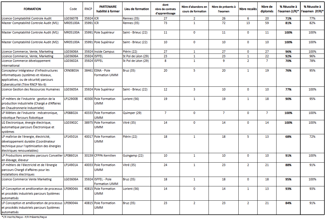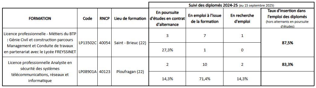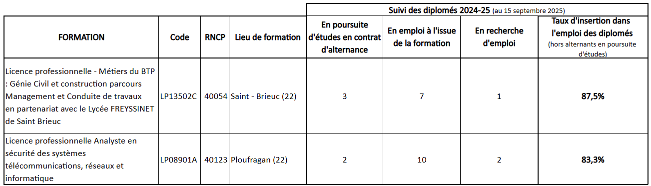 Le suivi des diplomés est opéré par les partenaires du Cnam Bretagne. Les données sont disponibles sur leurs sites internet respectifs conformément aux obligations.